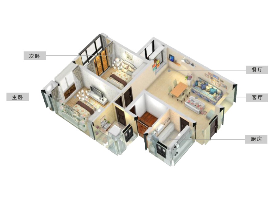 包含客廳、餐廳、主臥、次臥、廚房、衛(wèi)生間六大空間